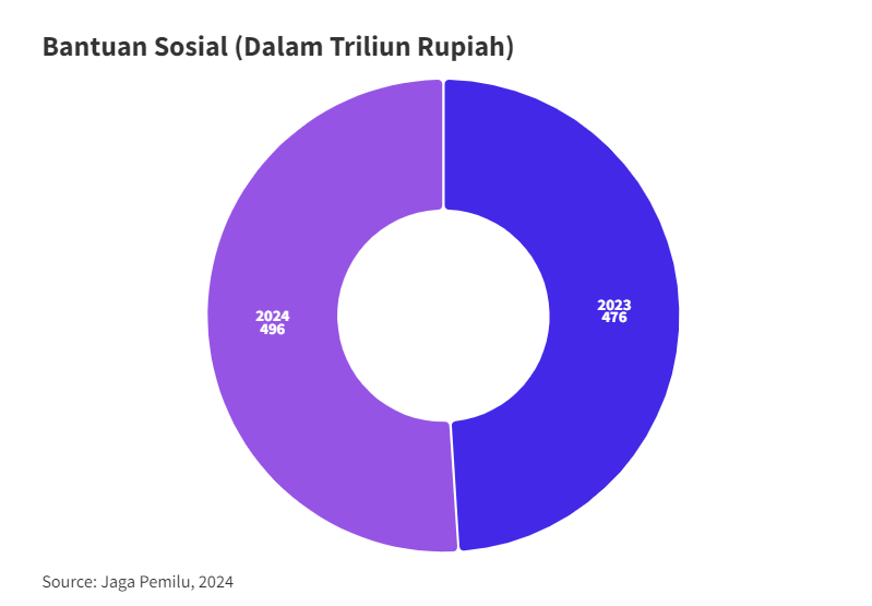 Jurnalismedata --- Jelang Pemilu, bantuan sosial dari pemerintah meningkat dari 476 triliun pada tahun 2023 menjadi 496 triliun pada tahun 2024. Menariknya, bansos tahun 2024 sudah mulai dibagikan pada bulan Januari-Februari 2024, padahal tahun-tahun sebelumnya baru dibagi bulan Maret.