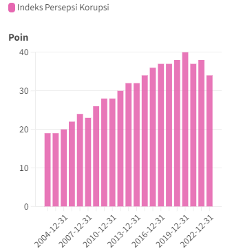 Jurnalismedata.id -- Indeks Persepsi Korupsi Indonesia terus menurun sejak tahun 2020. Indonesia pernah mencapai nilai tinggi 40 pada tahun 2019. Tetapi setelah itu terus menurun, sampai terakhir tahun 2022 nilainya adalah 34 (Indeks tahun 2023 belum keluar).