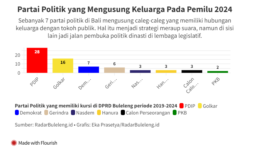 Seperti yang terjadi di Bali. Pada Pemilu 2024 lalu, ada 69 caleg yang mempunyai hubungan kekerabatan dengan tokoh publik, dari Bupati sampai Menteri. Sementara itu ada 6 kepala daerah atau wakil kepala daerah yang memiliki kekerabatan dengan beberapa caleg yang maju.