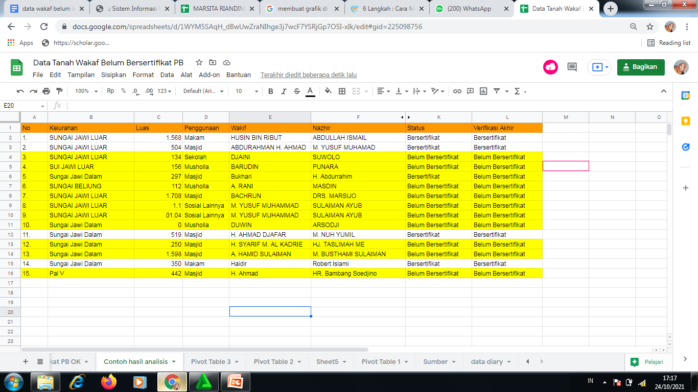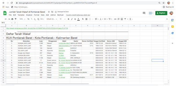 Usai pembersihan data, maka dapat melanjutkan untuk menganalisis data. Caranya, tentukan data yang ingin dicari pada tabel yang disajikan. Misalnya, ingin mendapatkan jumlah tanah wakaf di Pontianak yang belum bersertifikat. Maka pada spreadsheet, tanah wakaf yang belum bersertifikat ditandai dengan kolom kosong pada nomor sertifikat.