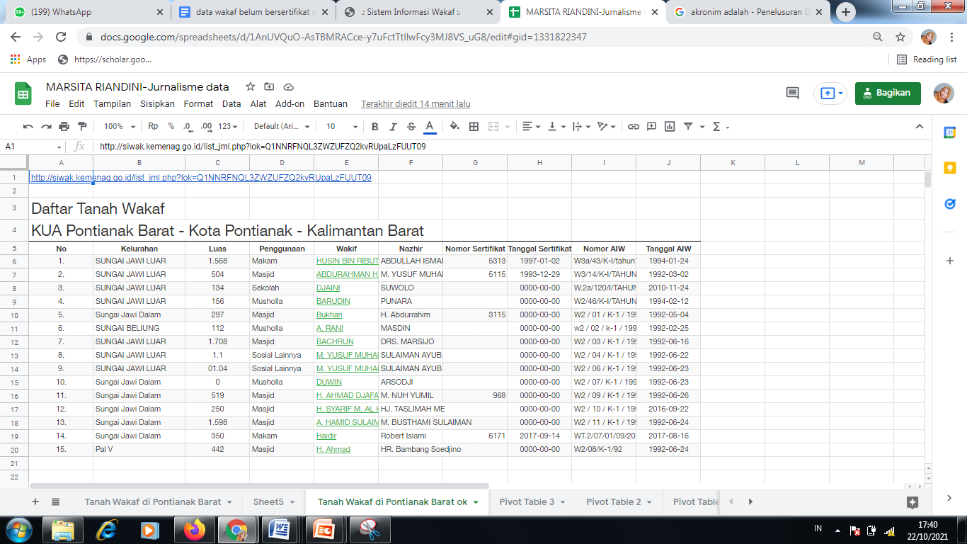 Lalu setelah pembersihan, nama sheet duplikasinya diganti menjadi Tanah Wakaf di Pontianak Barat OK