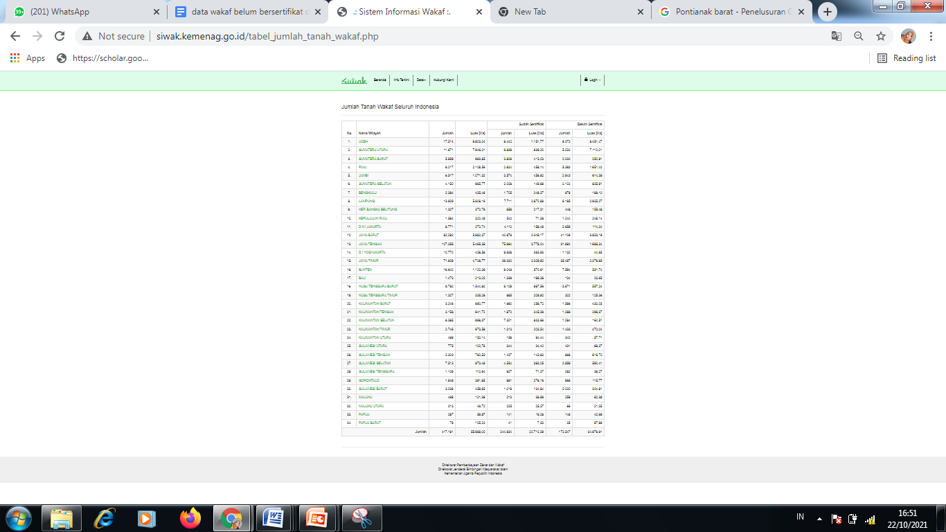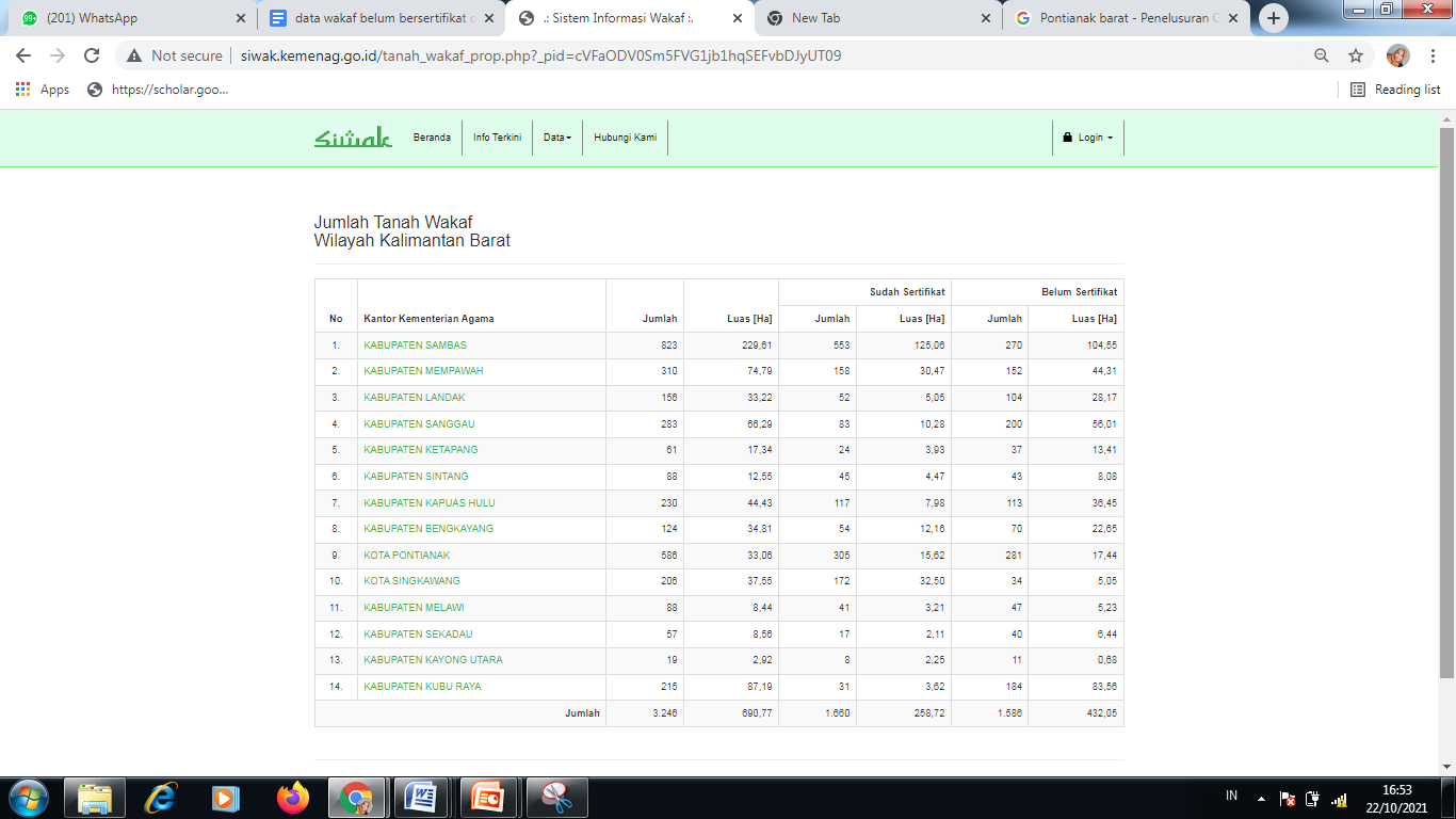 Lalu, pilih wilayah “Kota Pontianak”. Maka akan muncul jumlah tanah wakaf Kota Pontianak.