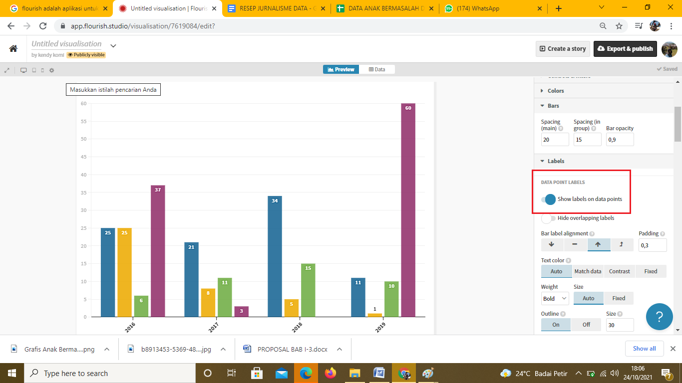 Karena angka jumlah anak tidak terlalu jelas, kita bisa mengatur pada bagian kanan halaman dengan pilihan pengaturan Label. Klik tulisan Show Labels on data point. Hasilnya pada setiap diagram batang muncul angka jumlah anak seperti di tangkapan layar di bawah ini.