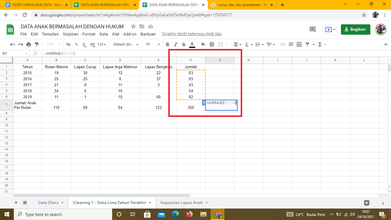Gambar 37. Mencari rata-rata kasus selama lima tahun dengan rumus =AVERAGE
