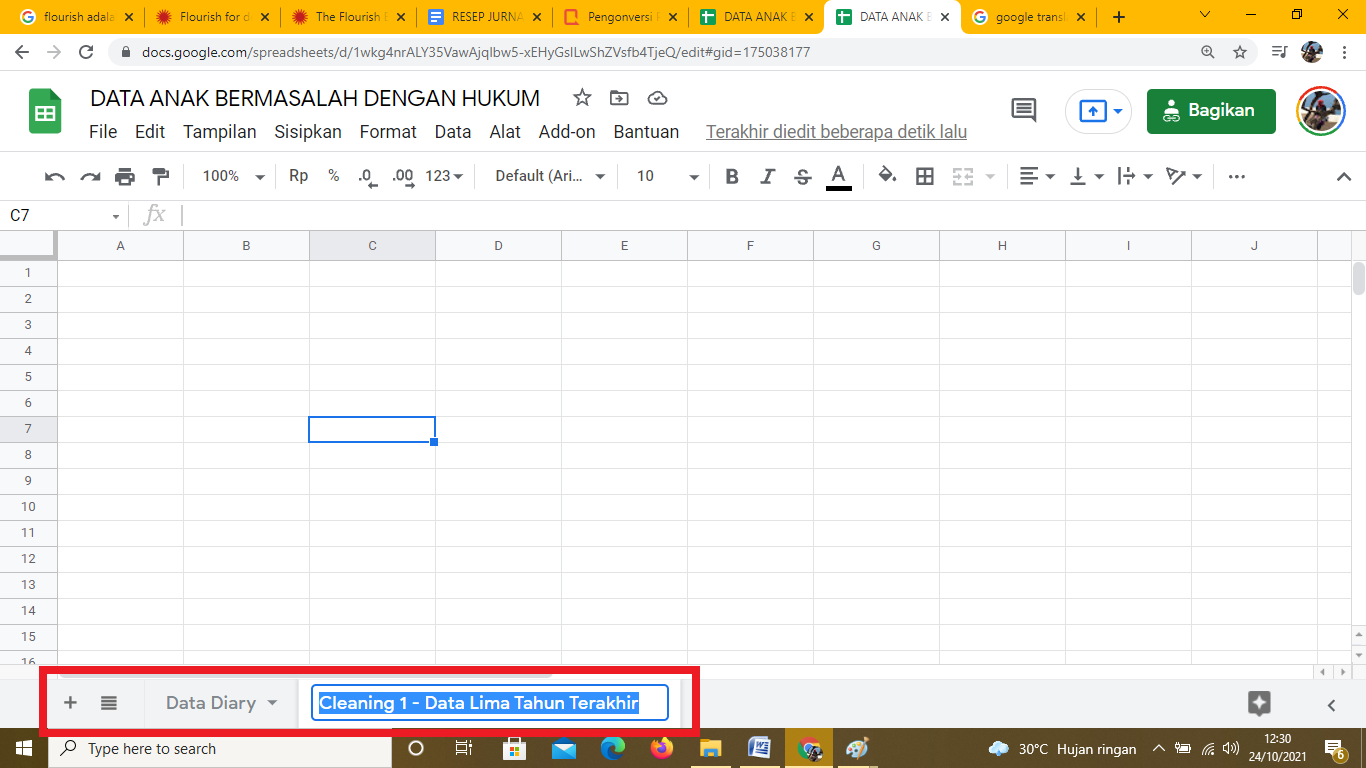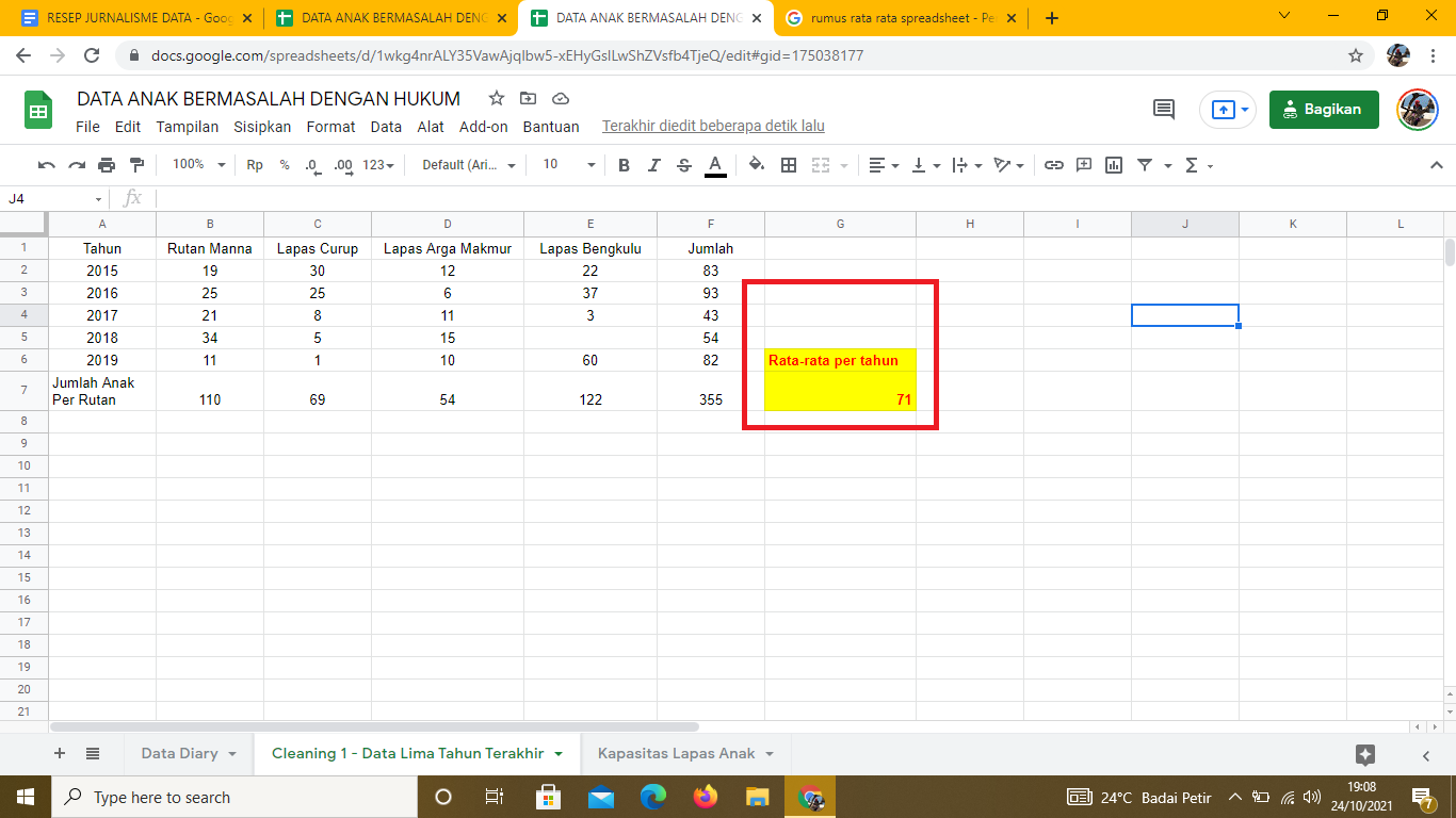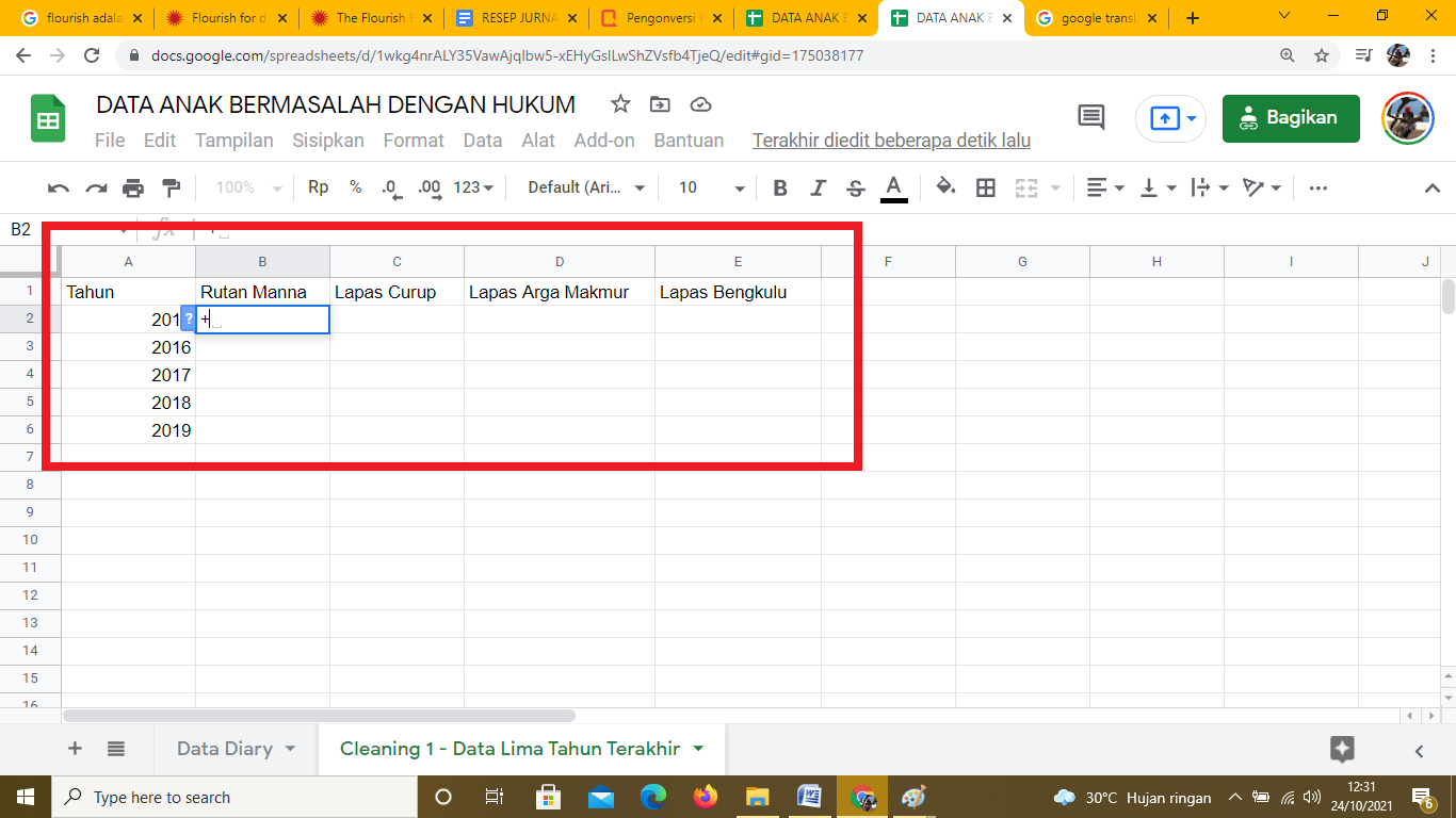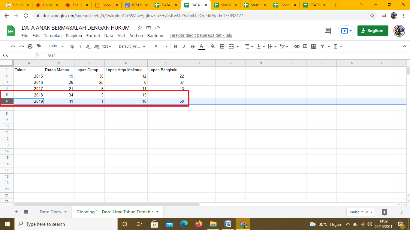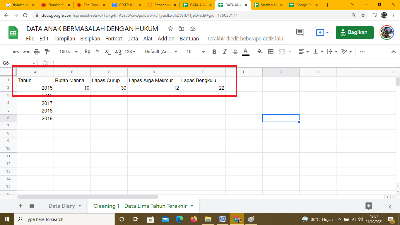 Sheet kedua dipakai untuk mengumpulkan data a jumlah anak bermasalah dengan hukum selama 5 tahun terakhir (2015,2016,2017, 2018, 2019) di 4 lapas/ rutan. Sheet kedua ini diberi nama Cleaning 1 - Data Lima Tahun Terakhir
