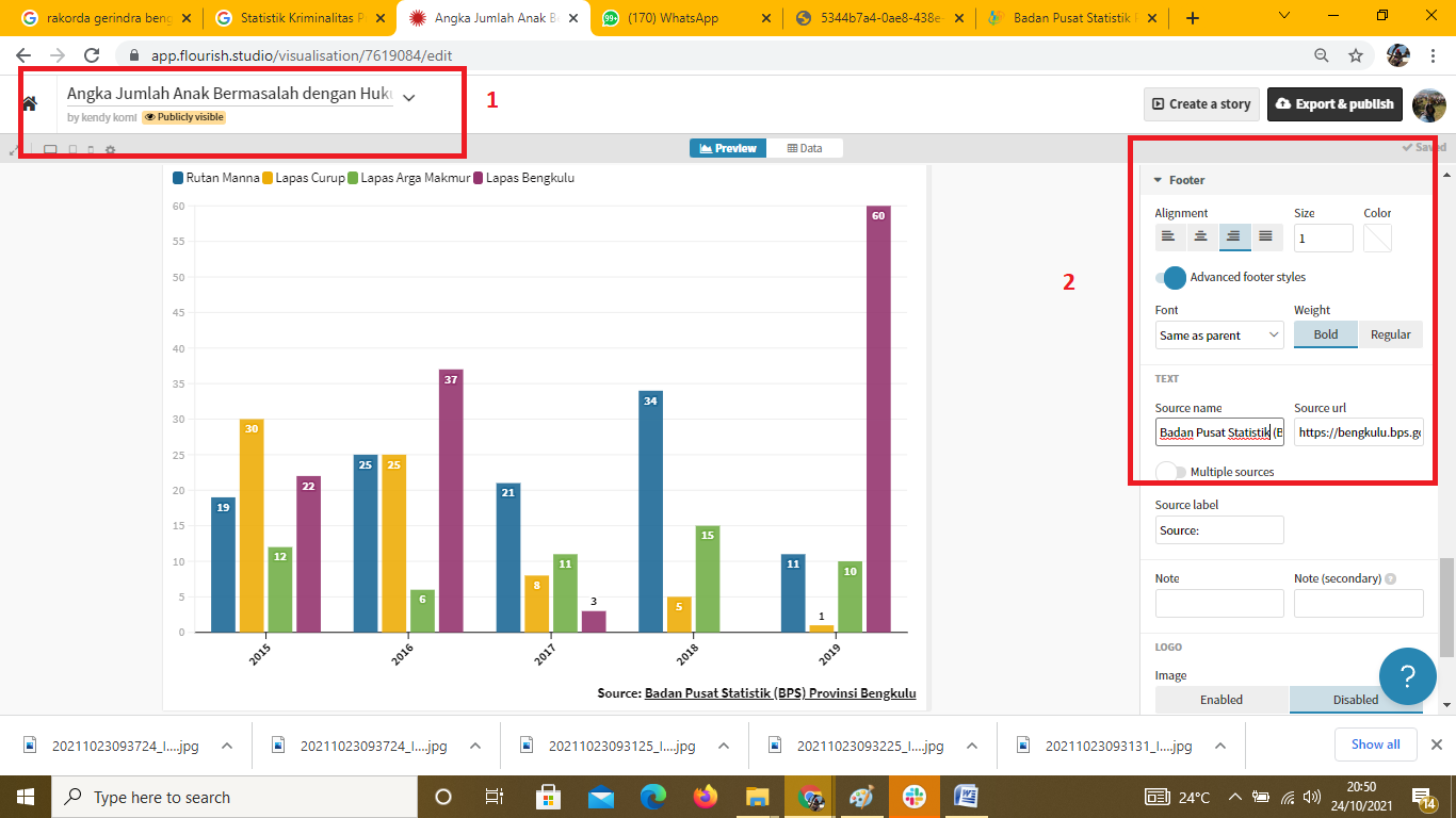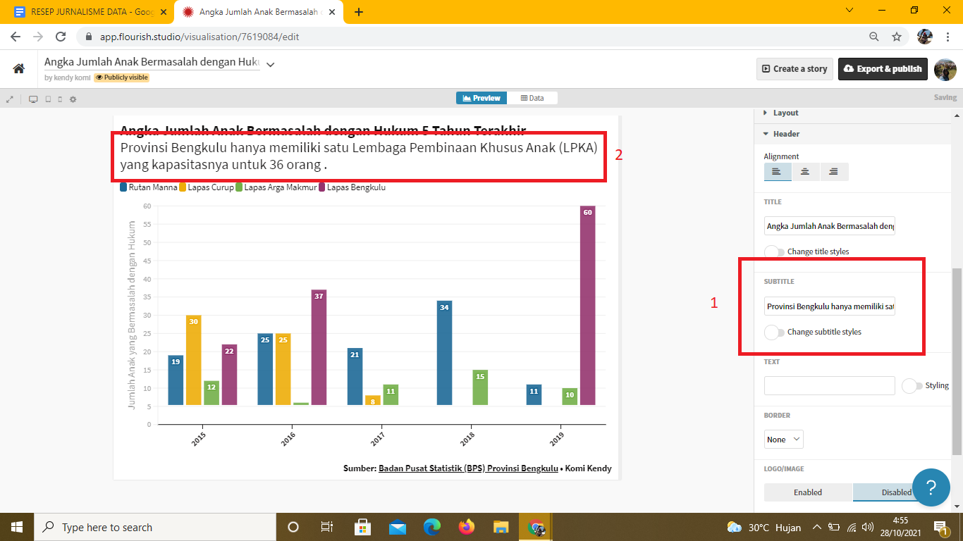 Bubuhkan Judul Grafik Batang ini pada bagian header. Caranya adalah dengan klik dua kali pada area Untitled Visualisation. Ketik judul sesuai dengan data yang dikerjakan. Pada gambar di bawah pada kotak merah dengan nomor 1 menunjukkan judul infografik yang diubah menjadi Angka Jumlah Anak Bermasalah dengan Hukum. Selain itu pada kotak nomor 2 juga bisa memasukkan sumber data pada bagian Footer di sebelah kanan: