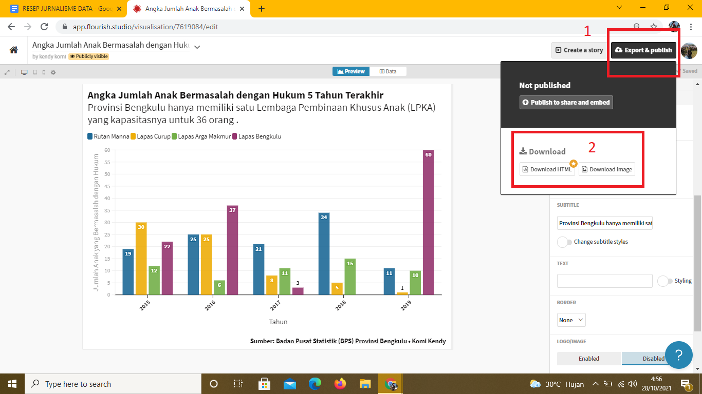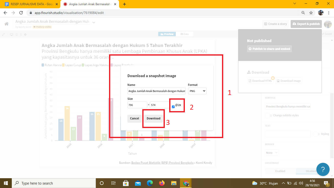 Setelah pengaturannya sesuai, grafik batang ini bisa digunakan untuk dipasang ke laman portal media atau bisa diunduh ke dalam bentuk file PNG dengan mengklik kolom Export & Publish. Lalu pilih Download image. File juga bisa didownload dalam format html, namun fitur ini khusus untuk pengguna premium dan berbayar.