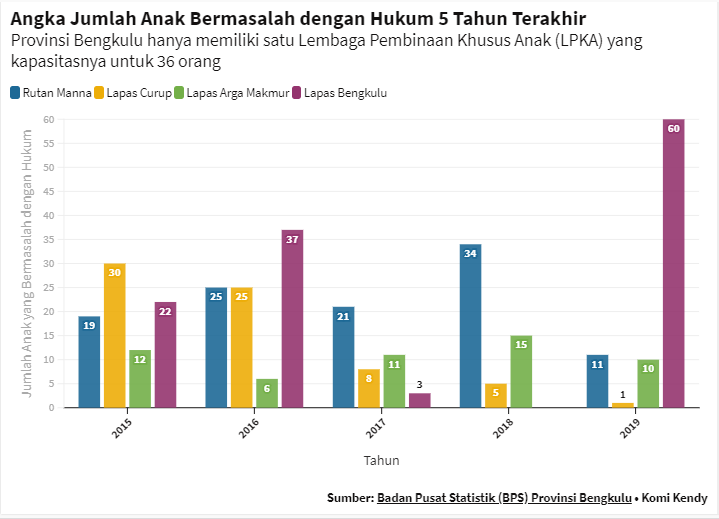 Jurnalisme Data---Jumlah anak bermasalah dengan hukum di Provinsi Bengkulu, perlu menjadi perhatian. Utamanya karena di Provinsi Bengkulu hanya memiliki satu Lembaga Pembinaan Khusus Anak (LPKA) yang kapasitasnya terbatas untuk 36 orang saja. Setiap tahun, jumlah anak bermasalah dengan hukum melebihi kapasitas tersebut.