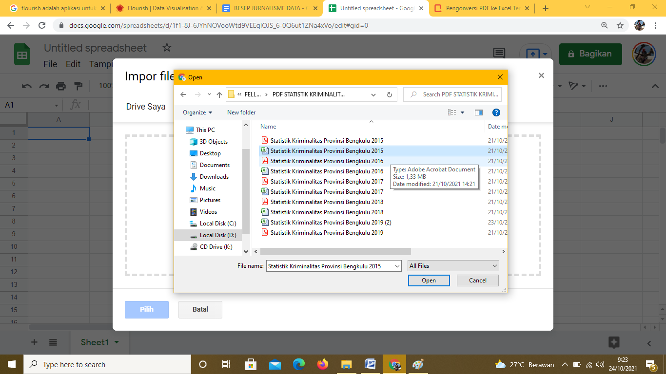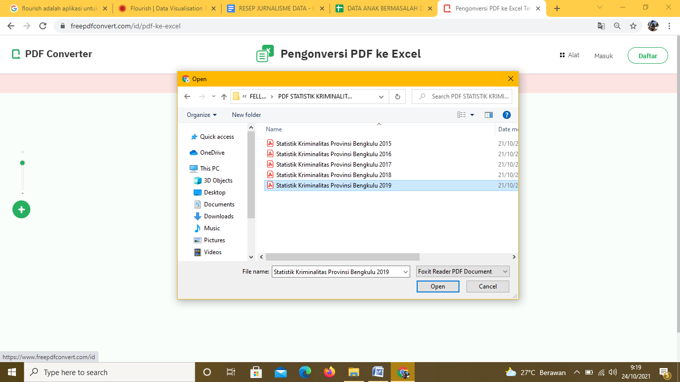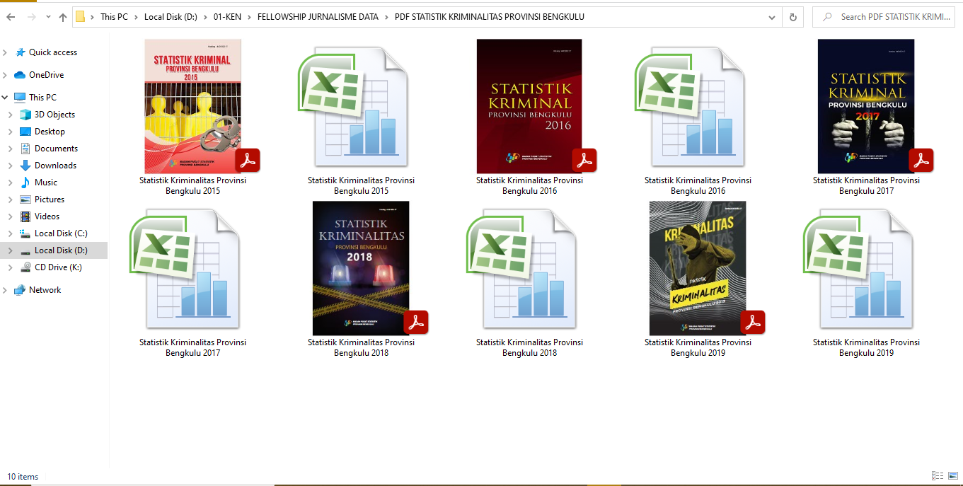 File-file pdf yang sudah didownload itu, dikumpulkan dalam satu folder untuk memudahkan dalam proses selanjutnya. Sebenarnya dibutuhkan pula data Statistik Kriminalitas Provinsi Bengkulu 2020, mengingat saat ini sudah tahun 2021. Akan tetapi BPS Provinsi Bengkulu baru akan merilis publikasinya pada akhir Oktober 2021.