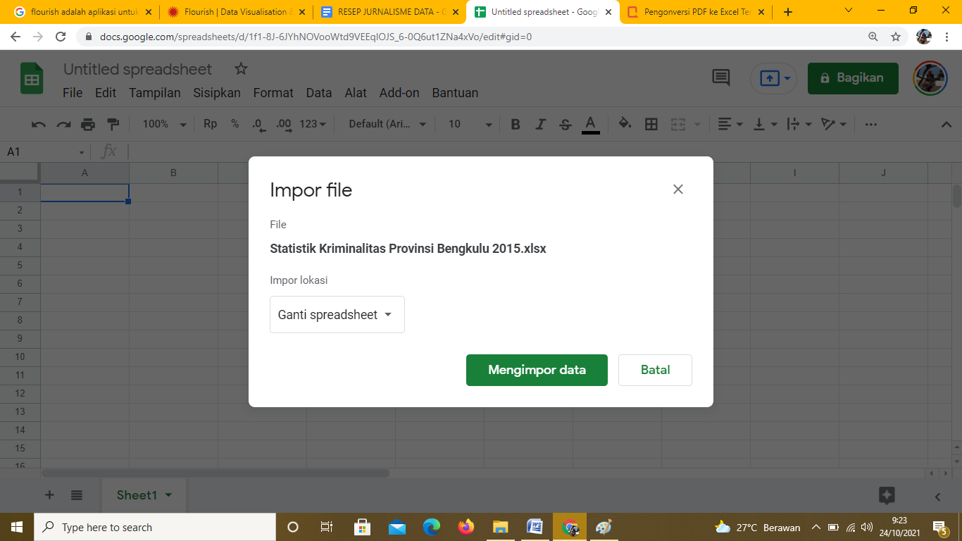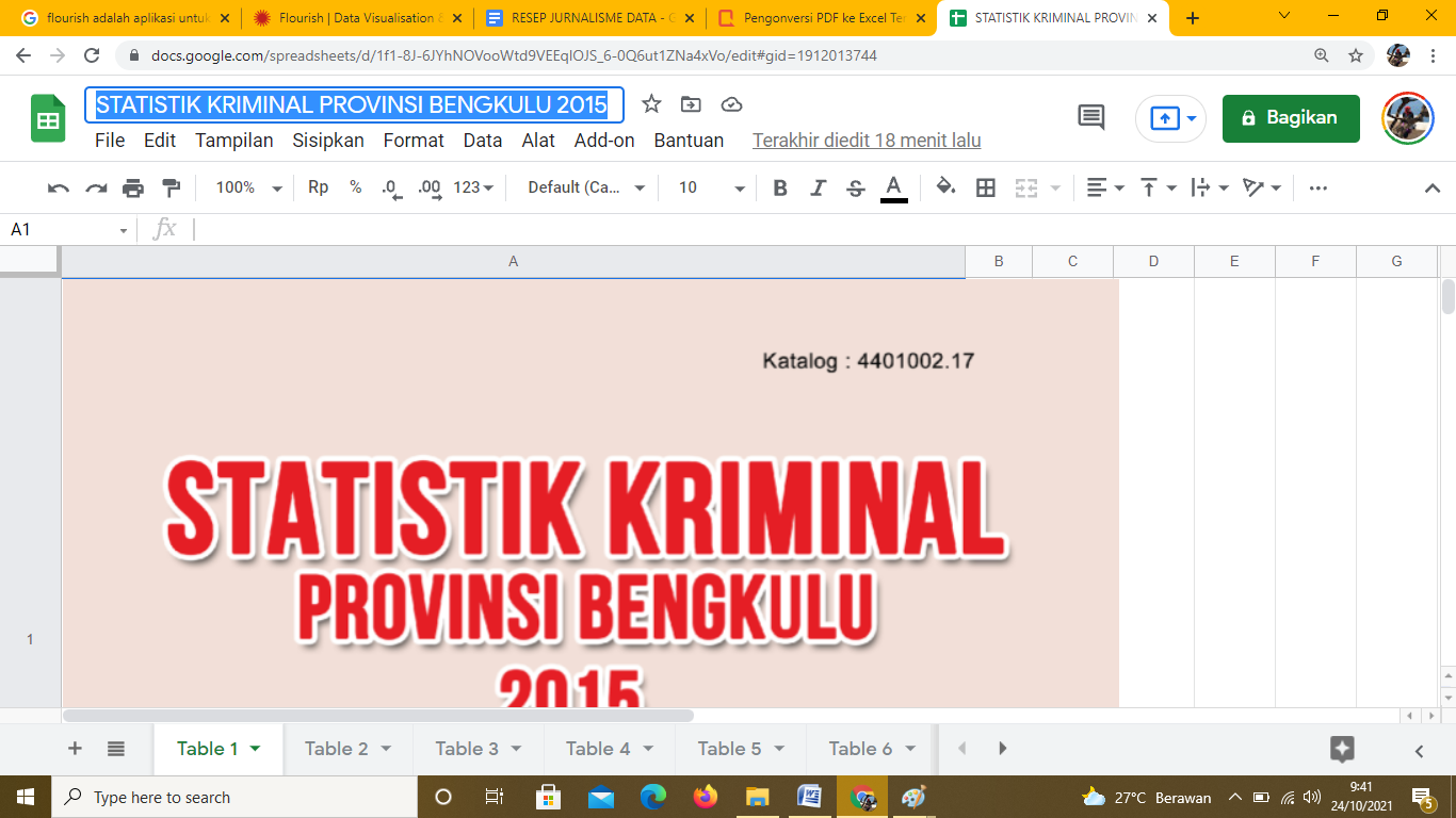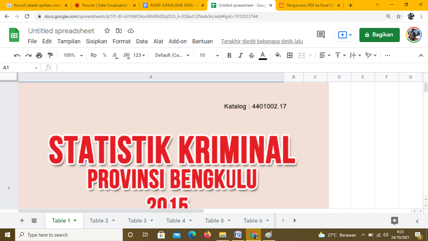 Langkah yang sama dilakukan pada file-file lainnya. Hasil file yang sudah diimpor ke spreadsheet bisa terlihat pada Statistik Kriminalitas Provinsi Bengkulu 2019.