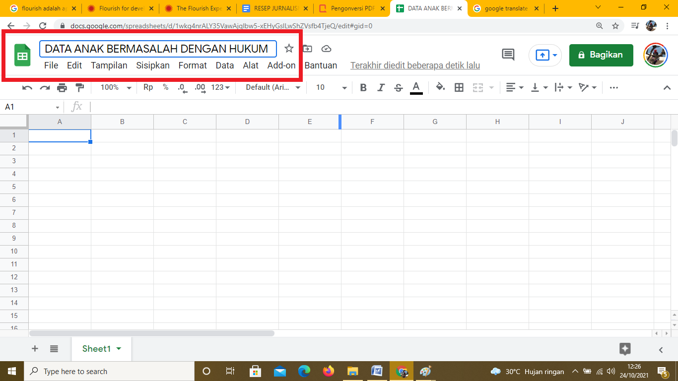 Buat halaman baru dan diberi nama pada bagian kiri atas sesuai dengan proyek yang sedang dikerjakan untuk mempermudah saat melakukan pencarian. Label nama file spreadsheet terlihat pada garis kotak warna biru yang sudah ditandai kotak merah pada gambar dibawah. Mengubah nama file bisa dilakukan dengan dua kali klik pada kolom label nama.