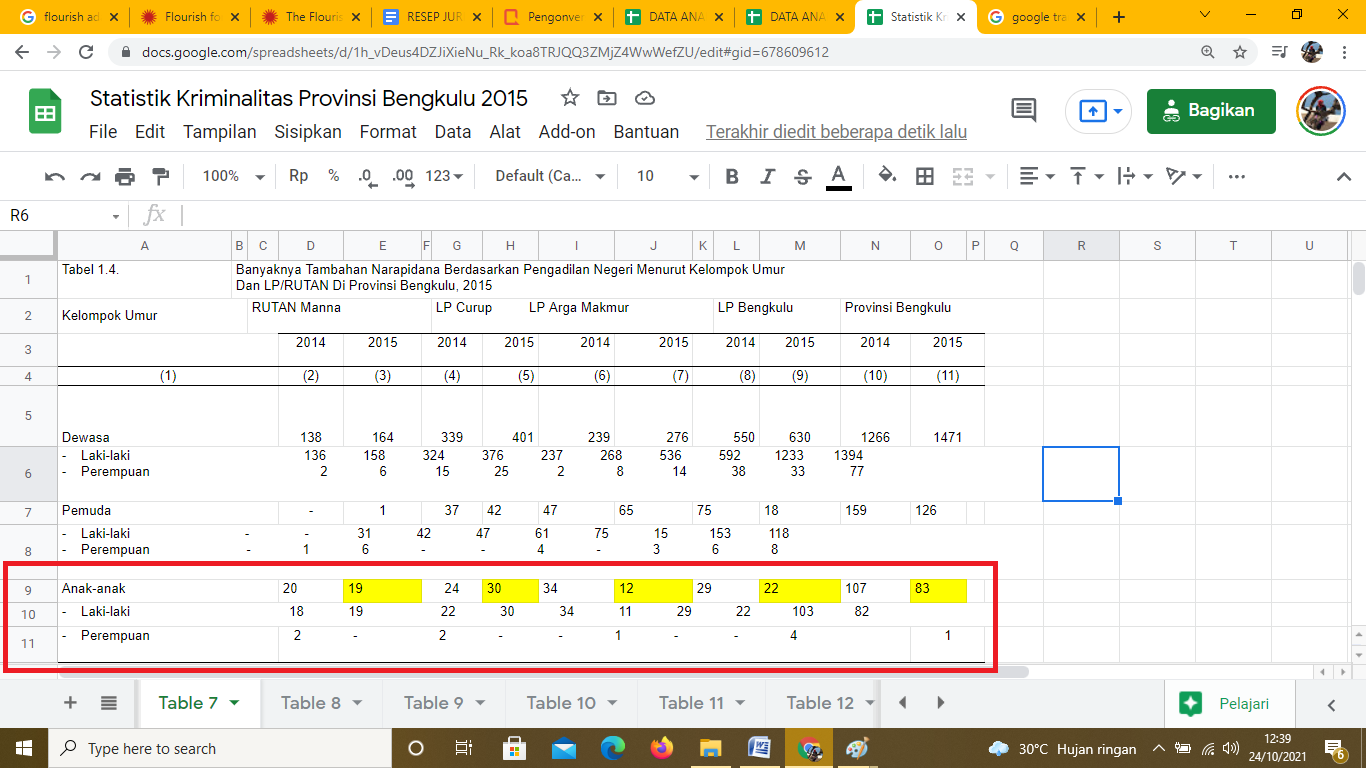 Ketika baru dibuka, data pada Statistik Kriminalitas Provinsi Bengkulu 2015 Sheet Table 7 setiap barisnya bisa dirapikan terlebih dahulu dan diberi tanda warna kuning agar angka mudah dipindahkan.