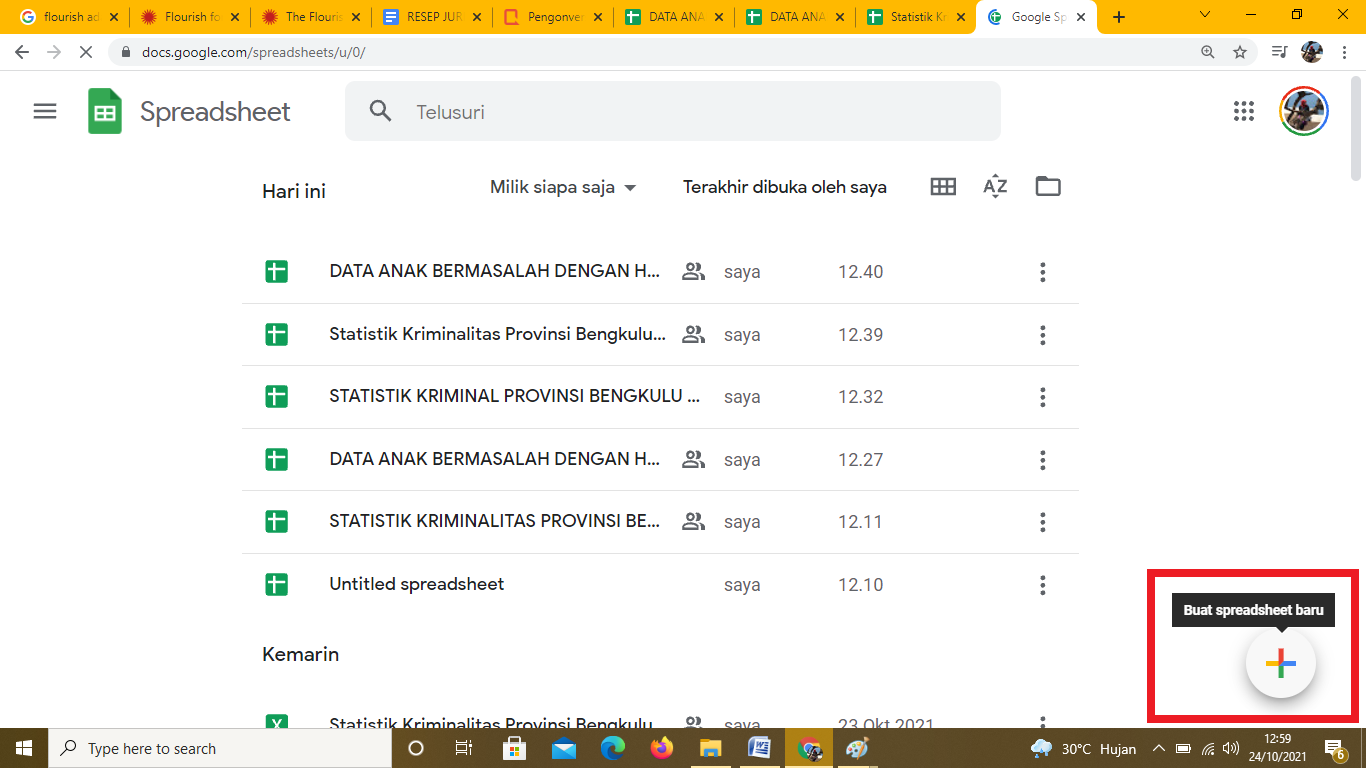 Saat membuka link Spreadsheet ini kita bisa mendapatkan halaman baru dengan meng-klik logo + warna warni pada bagian kanan bawah. Bisa dilihat pada gambar dibawah ini yang sudah ditandai kotak berwarna merah.