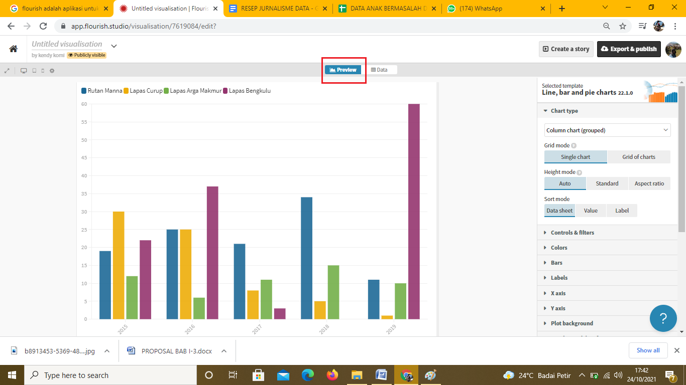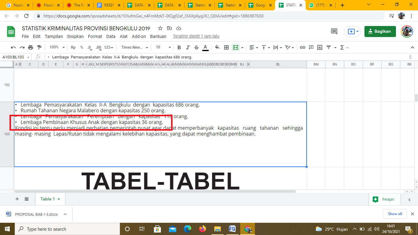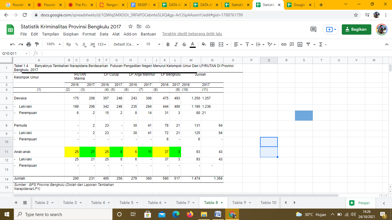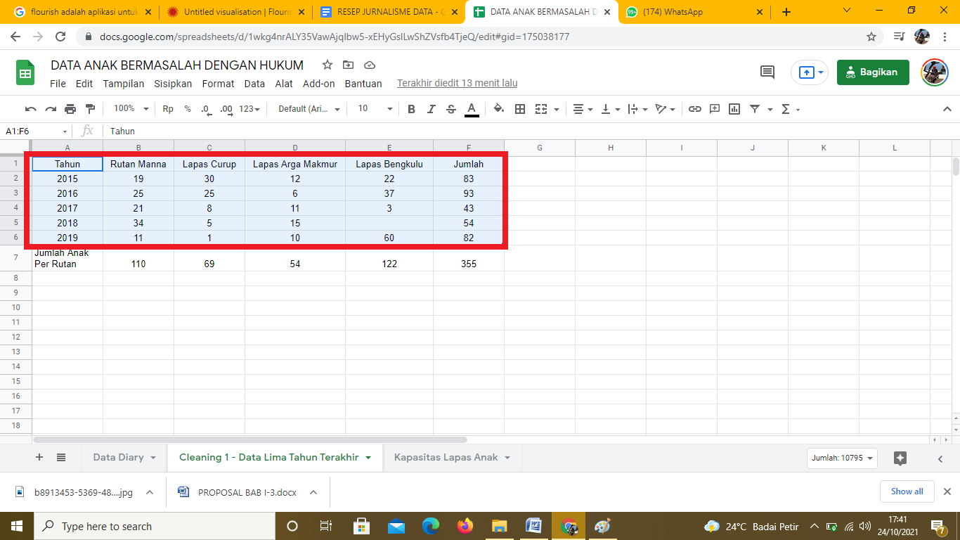Pengolahan data jumlah anak bermasalah dengan hukum selesai dilakukan. Data ini yang selanjutnya akan divisualisasikan menggunakan platform online Flourish.Studio. Namun sebelum ke Flourish, saya juga mengambil data jumlah ruang tahanan yang ada di LPKA yang ada pada Statistik Kriminalitas Provinsi Bengkulu 2019. Data terdapat pada bagian penjelasan Baris 103. Selain itu saya juga menuliskan kapasitas tahanan di Lapas/Rutan lainnya jika sewaktu-waktu diperlukan.