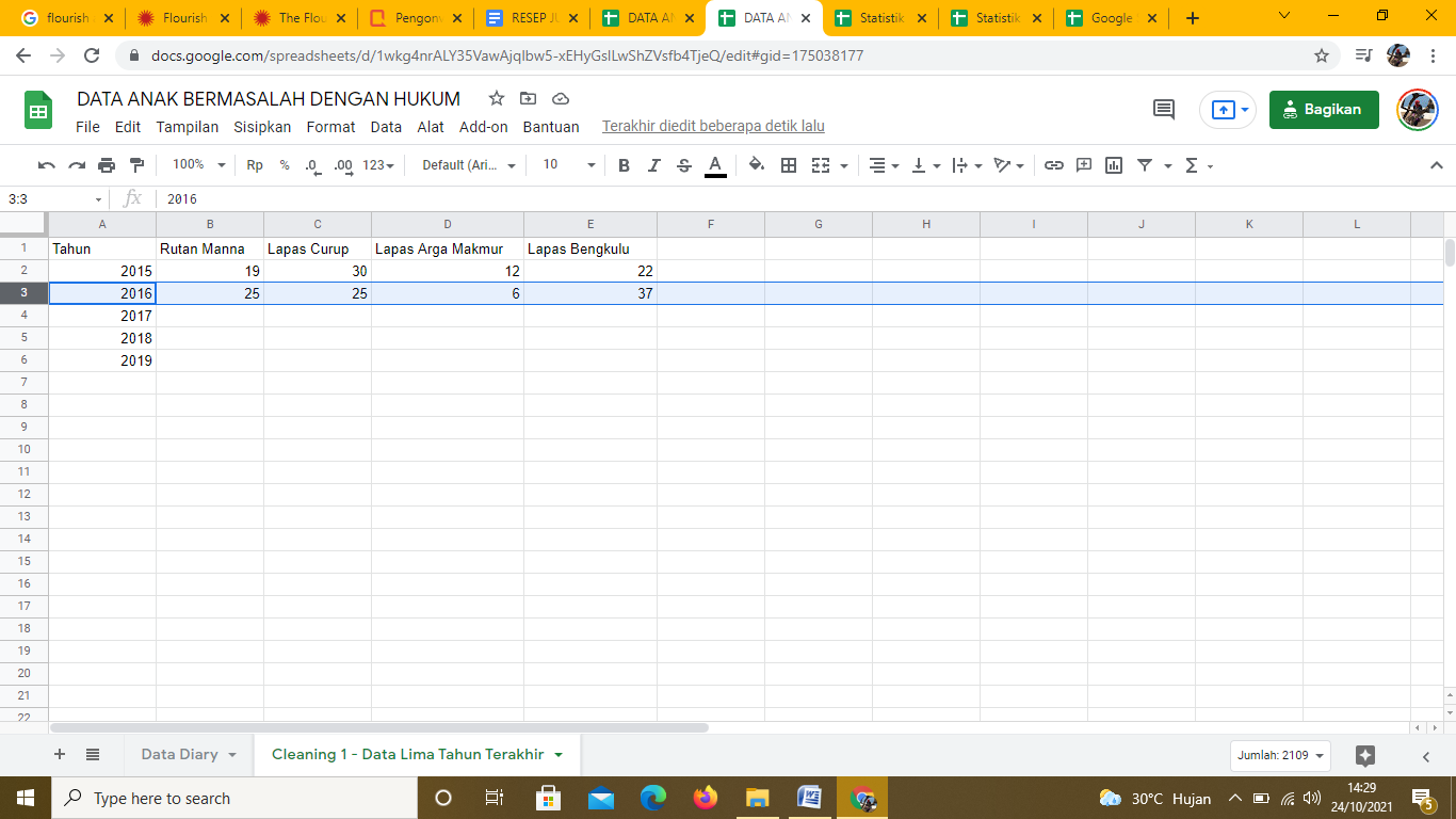 Angka yang sudah ditandai warna kuning merupakan data tahun 2016. Warna hijau adalah data 2016. Pindahkan satu per satu ke file Data Anak Bermasalah dengan Hukum Sheet Cleaning 1-Data Lima Tahun Terakhir. Masukkan data tahun 2016: