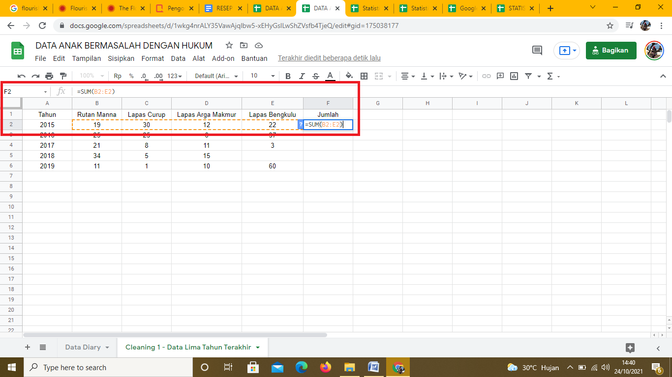 Penjumlahan pada spreadshet dilakukan dengan cara klik di kolom F2. Lalu ketik di formula bar rumus =SUM(B2:E2) untuk mendapatkan data jumlah anak 5 tahun di empat rutan/lapas. Rumusnya dapat dilihat pada tangkapan layar berikut: