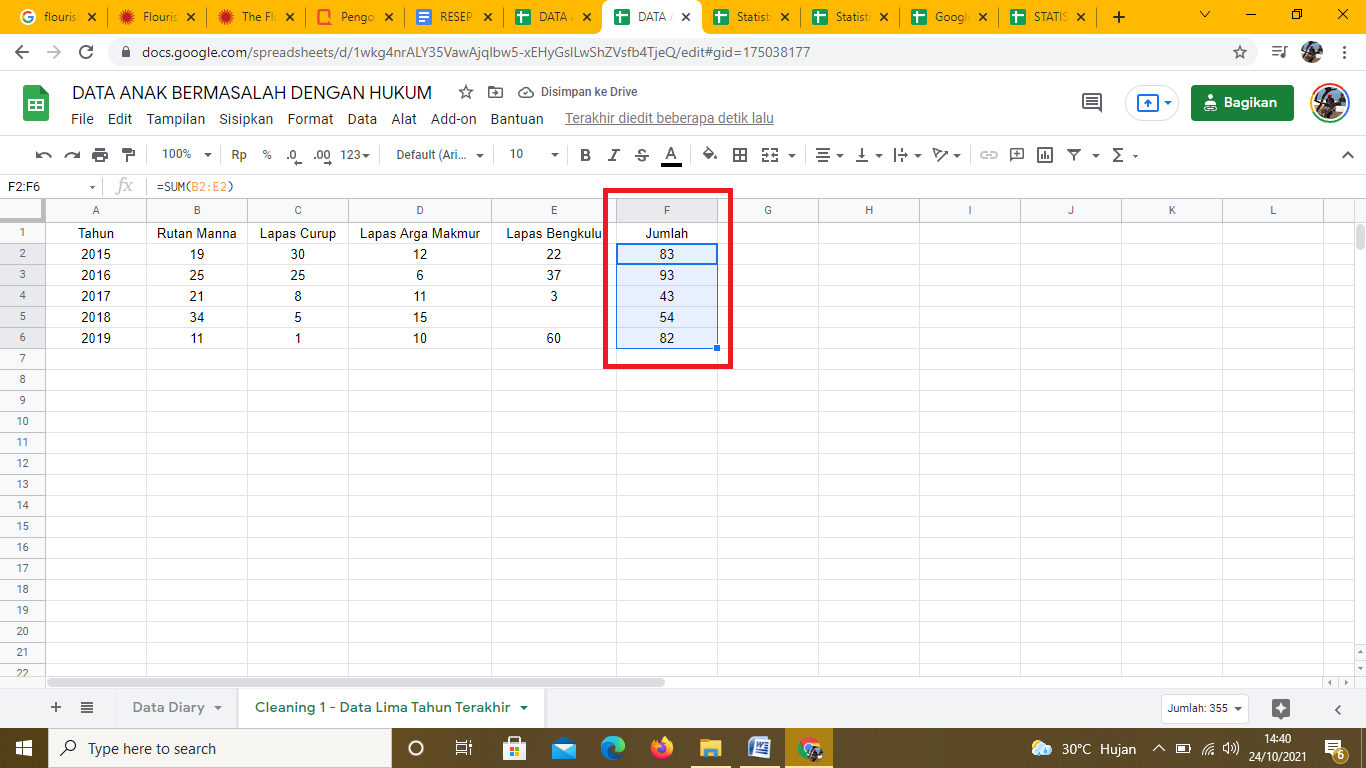 Setelah data anak yang bermasalah dengan hukum lengkap dari A2 hingga E6, lakukan penjumlahan. Penjumlahan dilakukan untuk mengetahui data jumlah anak yang bermasalah dengan hukum selama lima tahun terakhir dari empat rutan/ lapas sekaligus, ata data lima tahunan per lapas.