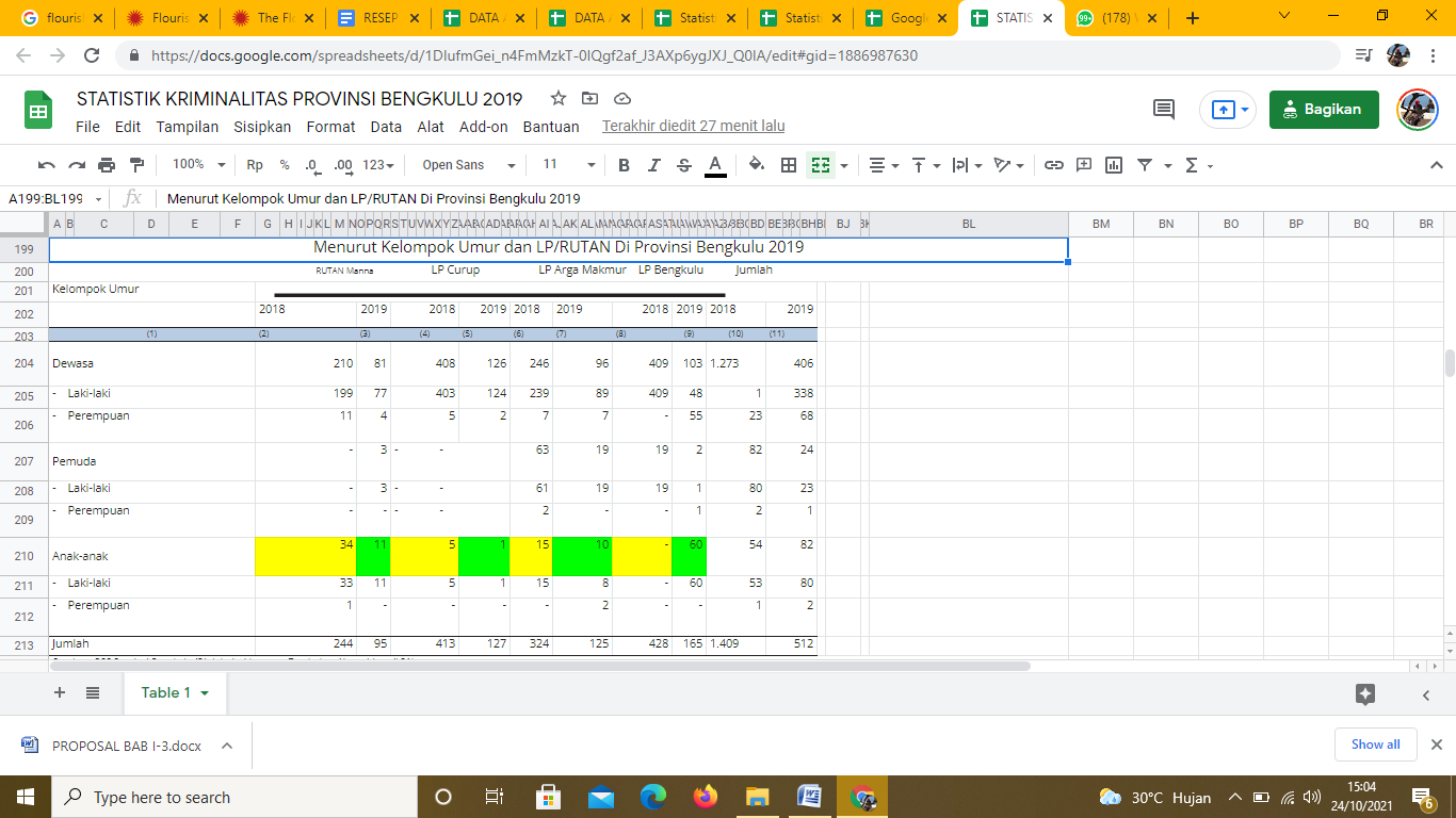 Perbedaannya, spreadsheet Statistik Kriminalitas Provinsi Bengkulu 2019 hanya terdiri dari 1 sheet saja. Pencarian data dilakukan scrool ke bawah hingga ditemukan data pada baris ke 201 Menurut Kelompok Umur dan LP/RUTAN Di Provinsi Bengkulu 2019. Tangkapan layarnya sebagai berikut: