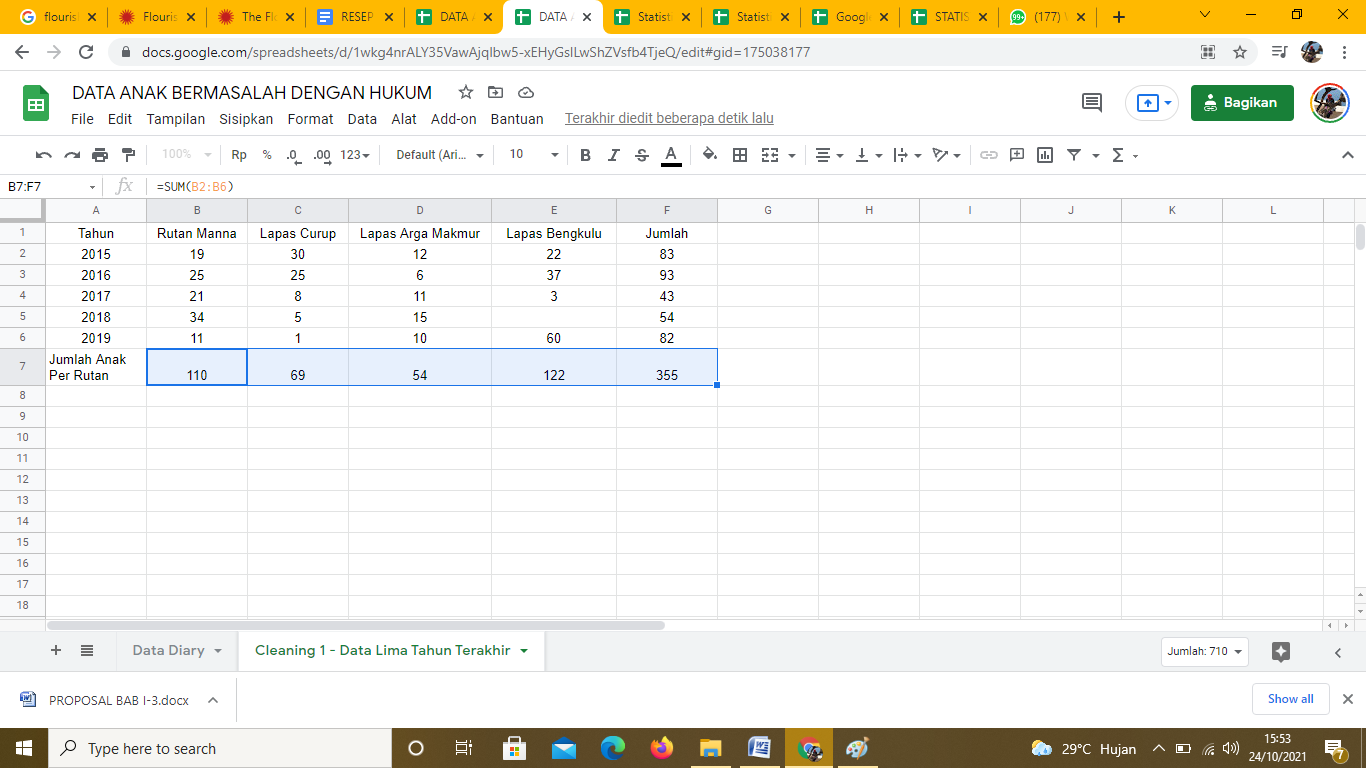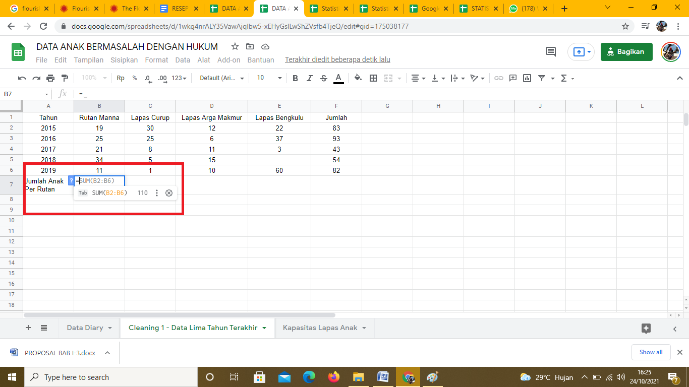 Pengolahan data selanjutnya dilakukan untuk mengetahui jumlah anak yang bermasalah dengan hukum di setiap rutan/ Lapas. Penjumlahan dilakukan dengan mengarahkan kursor ke arah kolom B7. Lalu masukkan rumus =SUM (B2:B6) pada formula bar. Tampilannya akan terlihat seperti ini: