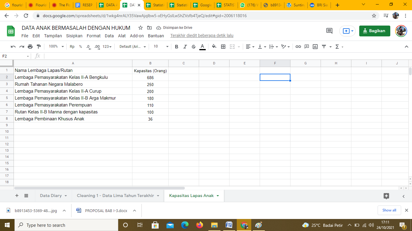 Data tersebut saya himpun di sheet baru yang diberi nama Kapasitas Lapas Anak. Hasil tangkapan layarnya sebagai berikut: