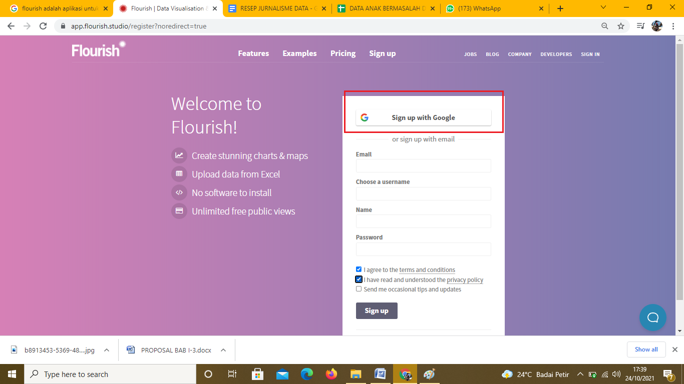Pengguna bisa mengisi secara manual kolom Email, Choose a username, Name, Password. Selain itu bisa juga dengan menautkan dengan akun Google di kotak merah. Jangan lupa centang persetujuan syarat dan kondisi.