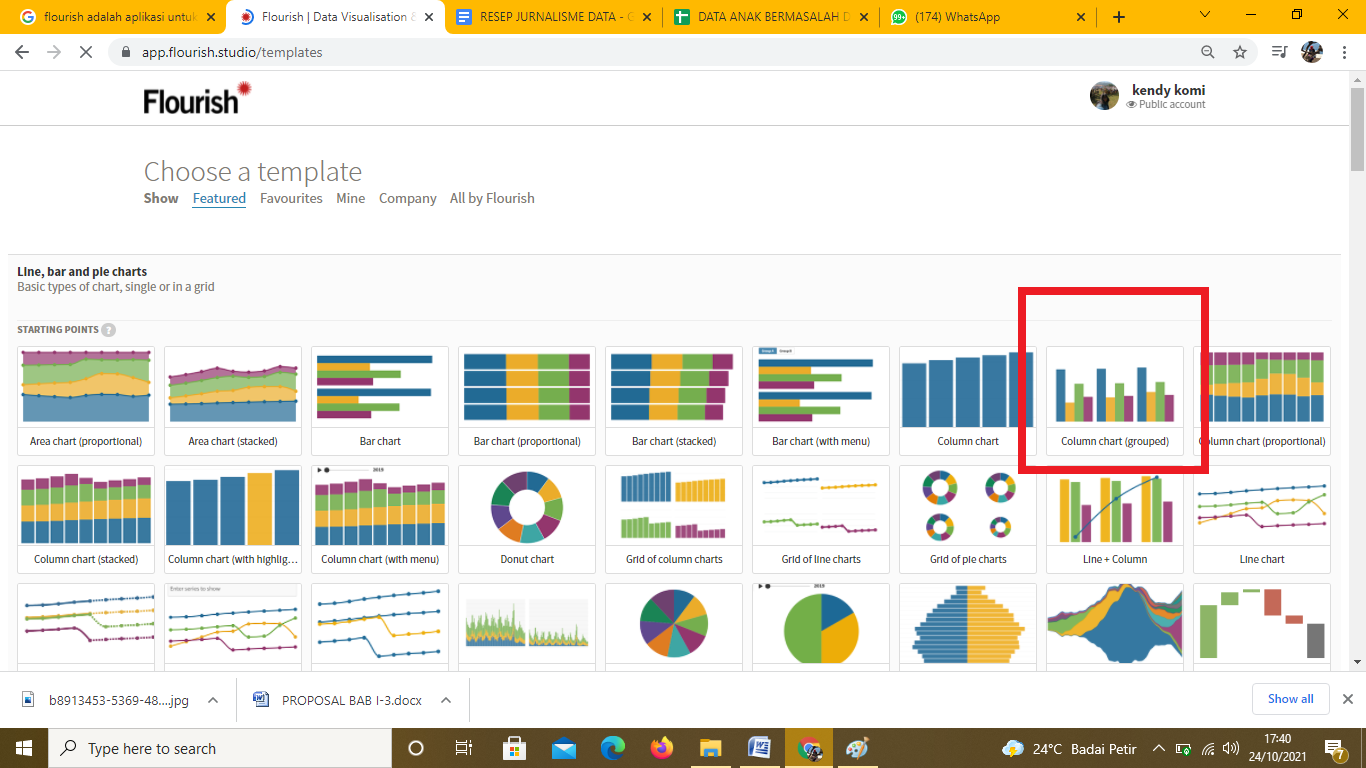 Dari tampilan gambar di atas terlihat aneka macam diagram garis, batang, lingkaran yang bisa dipilih dengan menyesuaikan data yang dimiliki. Untuk memperlihatkan perbandingan angka narapidana anak selama lima tahun di empat rutan/ Lapas, saya memilih template Column chart (grouped) seperti kotak merah pada gambar di atas.