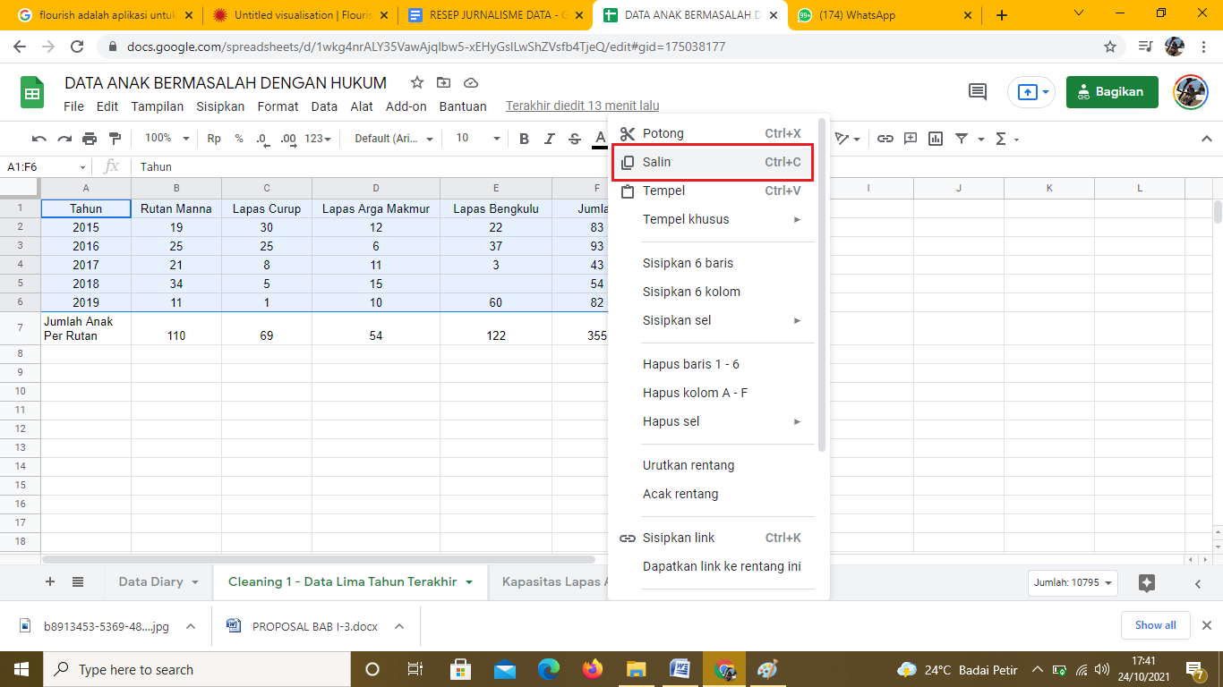 Langkah berikutnya adalah kembali ke file spreadsheet Data Anak Bermasalah dengan Hukum untuk menyalin data. Blok data yang akan disalin lalu copy: