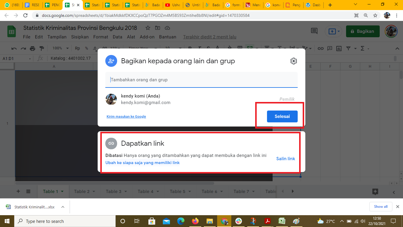 Mengubah akses pada menggunaan google doc atau goole spreadsheet perlu dilakukan jika ingin membagikan file kepada orang lain. Setelannya pun bisa diubah pemilik link hanya bisa melihat, bisa mengedit (editor), atau bisa ditujukan pada orang tertentu yang sudah didaftarkan emailnya. Agar setelan tersimpan, jangan lupa klik Selesai setelah tuntas melakukan pengaturan.