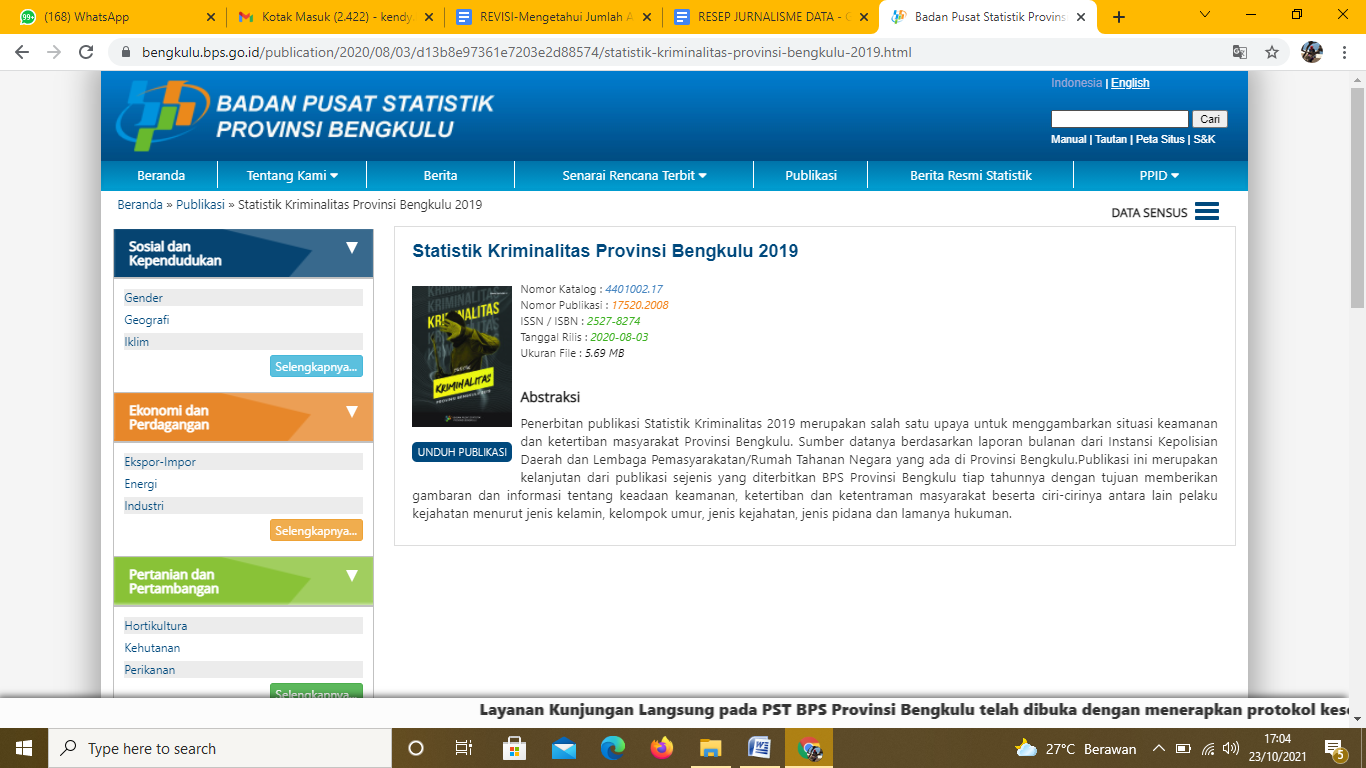 Lima buku publikasi Statistik Kriminalitas Provinsi Bengkulu diunduh dalam format pdf. Meski bisa dibaca, namun untuk mengolah dan membersihkan data yang tidak diperlukan akan lebih mudah dilakukan dengan format file excel.